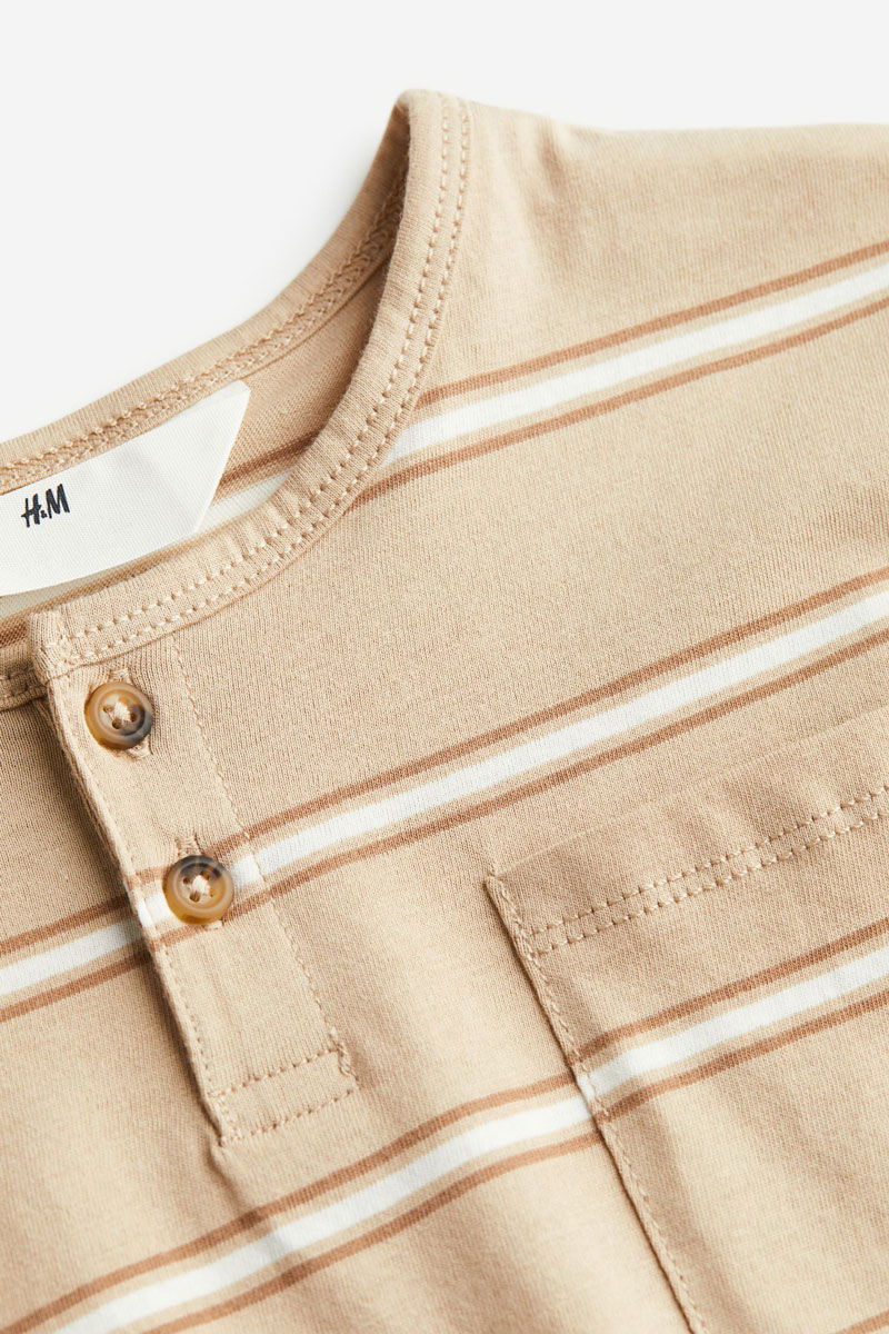 تاپ گشاد در لباسهای نخی نرم با نوار باریک دور یقه، کتانی با دکمه، شانههای افتاده، آستینهای کوتاه و یک جیب روی سینه.